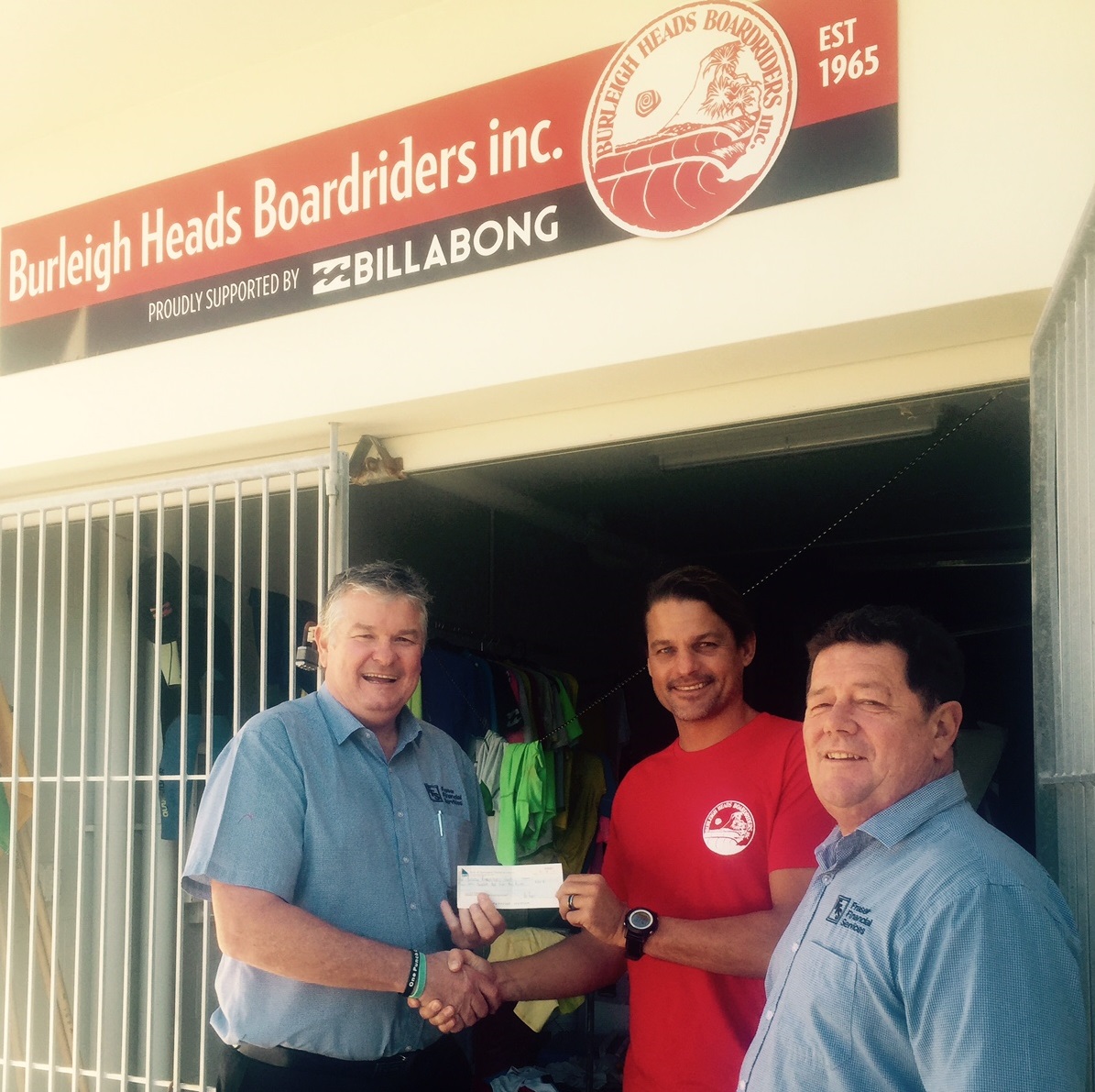 Ian Fraser presents Burleigh Boardriders Club President James Lewis with the first of many cheques supporting our club! For each member or their family that get a loan through Fraser Financial Services they will donate a percentage of their commision to the club. To get the Home, Investment, Car, Truck, or Commercial Equipment see Tappa, and not only will you get a great loan, you will be helping the Burleigh Boardriders
